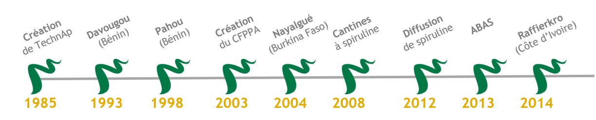 · 1997 : Accord de financement du projet Spiruline PAHOU par la commission européenne (budget : 200 K€). Ainsi de 1998 à 2001, grâce aux subventions de l'Union Européenne (UE) et du Ministère Français des Affaires Etrangères (MAE) complétées par les fonds propres de TechnAp, 8 bassins de 30 à 40 m² (total 260 m²) ont été construits sur un terrain appartenant au CREDESA (Centre Régional pour le Développement et la Santé) à PAHOU (BENIN), à 30 km à l’ouest de COTONOU.